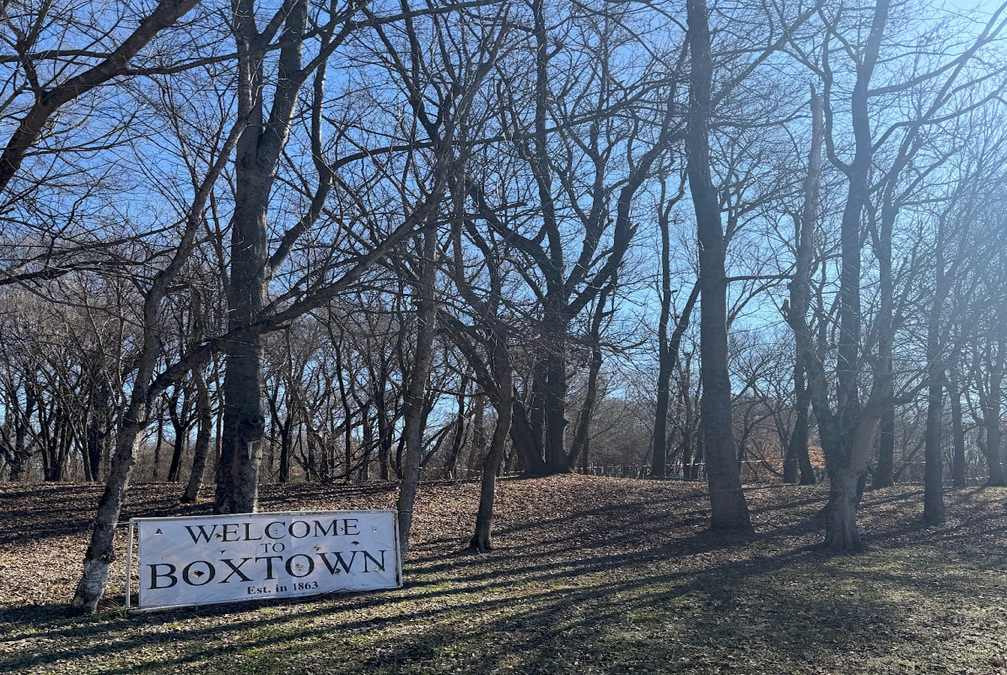 Visitors to Boxtown are greeted with a sign that proudly proclaims its founding in 1863, the same year that President Abraham Lincoln signed the Emancipation Proclamation. That dates are not coincidental: Boxtown was founded by newly-emancipated slaves and freedmen and began as an unincorporated, self-sufficient and tightly knit community. The name harks back to these origins, as, according to local lore, early residents built their homes from discarded railroad boxcars and scrap wood and other packing supplies.